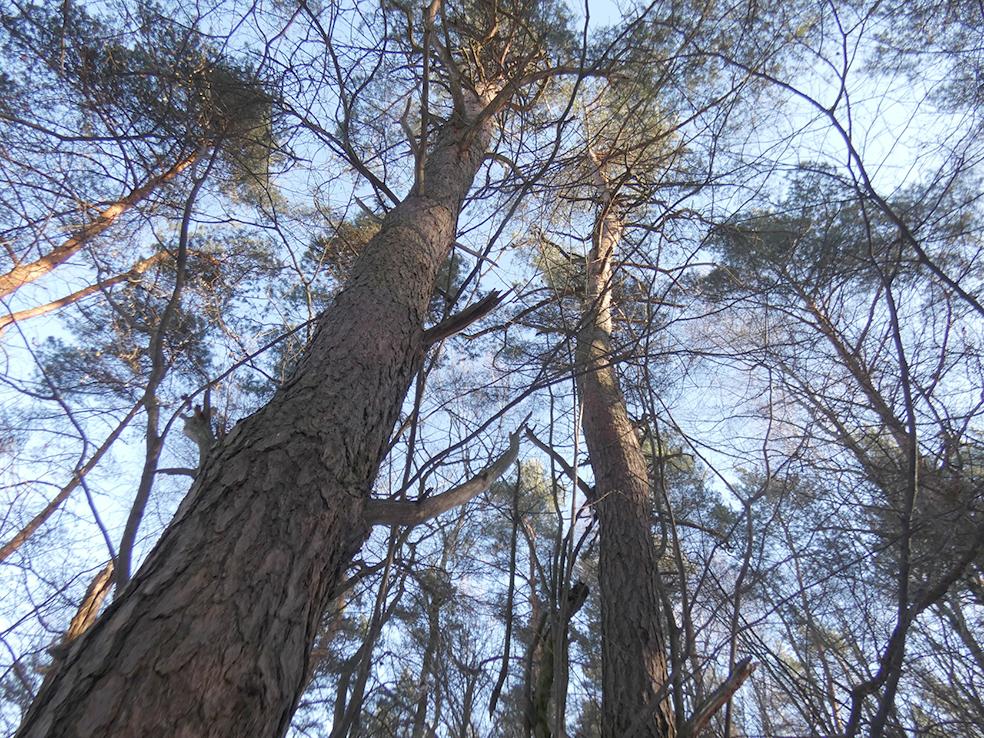 Kiedy po tutejszym lesie wędruje się w środku sezonu wegetacyjnego trudno w pełni ogarnąć jego bioróżnorodność. Teraz w oczy przede wszystkim rzucają się sosny zwyczajne. Wiele drzew tego gatunku jest bardzo starych, zdeformowanych. Z drzew iglastych widać spore płaty modrzewia europejskiego. Z drzew liściastych jest sporo brzozy brodawkowatej. Wciąż można podziwiać drzewo tego gatunku o widlasto rozgałęzionym pniu. Po raz pierwszy widzieliśmy się 5 lipca 2006 roku. Właściwie od tamtego czasu nie zmieniło się. W większej ilości występują tutaj dęby szypułkowe. Niektóre z nich pomimo sporych rozmiarów czują się młodo, ociągając się ze zrzucaniem liści. Są jeszcze okazałe lipy drobnolistne. Jedna z nich jest opanowana przez porosty. Warto jeszcze zauważyć okazałego buka pospolitego. Póki co to jedynak. Poza tym teraz w jednym z wyrobisk zauważyłem rozłamaną czeremchę zwyczajną. Kiedy gatunek staje się drzewem, w pewnym momencie przegrywa walkę z grawitacją. Tutaj na jej martwym drewnie rozwijają się płaty wrośniaka strefowanego.