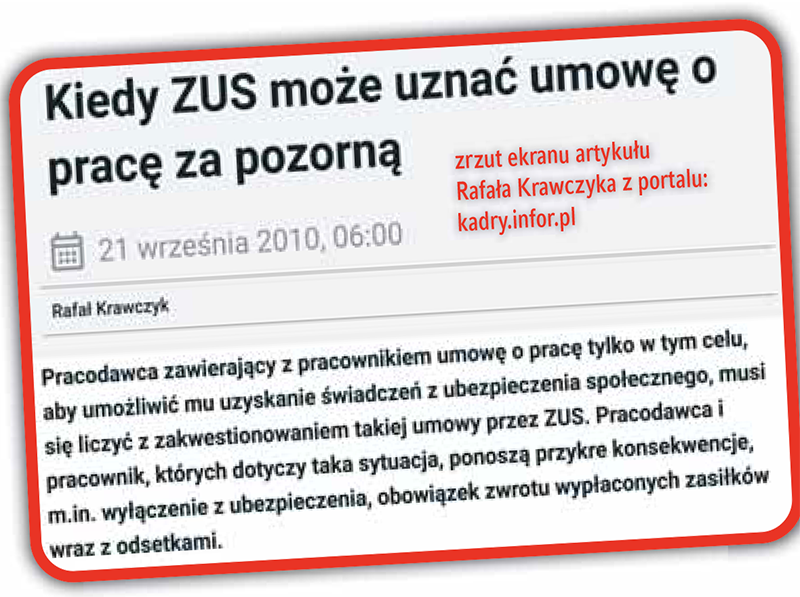 Prócz aspektu etycznego, jego posunięcie może zostać uznane jako działanie pozorne, którego konsekwencje mogą być bardzo poważne. Żeby nie być gołosłownym, na str. 2 prezentujemy zrzut ekranu artykułu Rafała Krawczyka z portalu kadry.infor.pl. Do pełnej treści artykułu odsyłamy pod adres: https://kadry.infor.pl/poprzednie_tematy_dnia/452194,Kiedy-ZUS-moze-uznac-umowe-o-prace-za-pozorna.html . Żeby pracować w elektrowni, Silbert musi podpisać umowę o pracę.