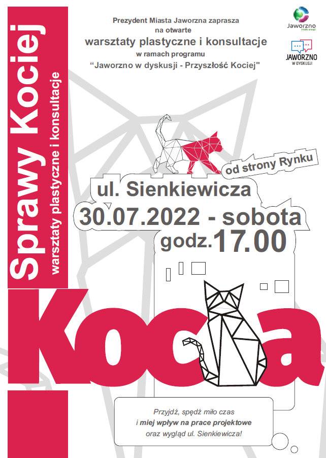 Konsultacje społeczne odnośnie do ulicy Henryka Sienkiewicza, zwanej potocznie "Kocią", połączone z warsztatami plastycznymi, odbędą się w ostatnią sobotę miesiąca, 30 lipca bieżącego roku, w ramach programu “Jaworzno w dyskusji – Przyszłość Kociej”. Zaprasza na nie sam Prezydent Miasta Jaworzna Paweł Silbert.