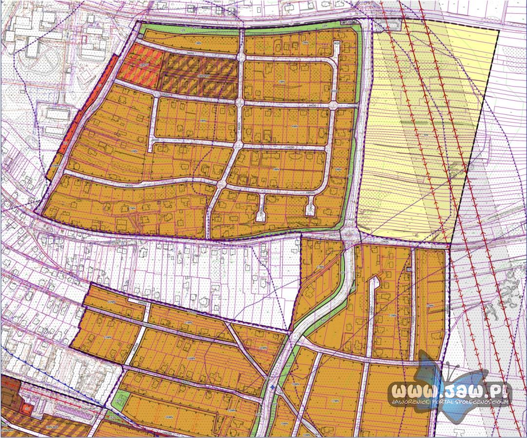 Na żółto zaznaczono teren rolnictwa z zakazem zabudowy (RN), a w przeznaczeniu uzupełniającym wpisano tam m.in. możliwość poprowadzenia tras pieszo-rowerowych. Obszar zakreślony paskami zielono-czerwonymi odpowiada terenowi usług kultu religijnego lub zieleni urządzonej (UR-ZP), dla którego w projekcie zakazano powstawania budynków, a