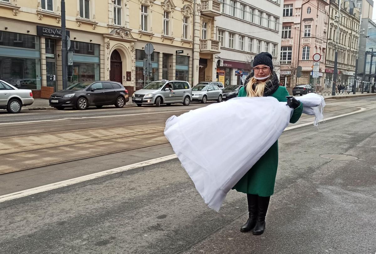 Foto: Anna Pycia na ulicy w Katowicach podczas protestu branży weselnej. Autor fotografii: Agnieszka Kucjas-Karkoszka.
