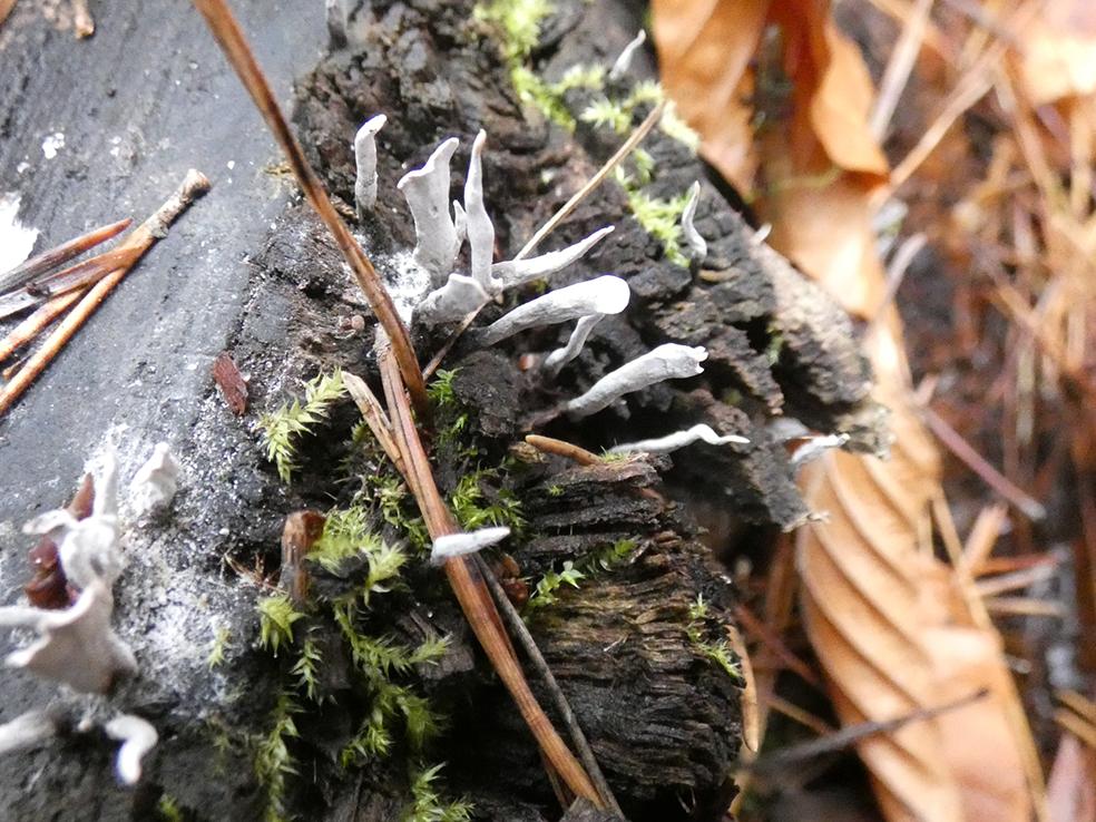 Dalsza część naszej wycieczki prowadziła przez las Dąbrowa. Tamże botanicznie szalu nie ma. Drzewostan, runo i bardzo wiele elementów jest tożsame z pobliską Ameryką. Dąbrowę przeszliśmy bardzo szybko w osi wschód-zachód. Tamże zachodnią krawędzią poszliśmy na północ, po czym weszliśmy pomiędzy drzewa i chcąc iść na północ, niechcący wyszliśmy na wschodni kraniec. Na skraju lasu trafił się inny amerykański akcent. To robinia akacjowa. Las znajduje się na podmokłym gruncie. Wskazuje na to obecność sitów rozpierzchłych. Do tego dochodzą płaty trawy trzęślicy modrej. Stosunkowo mało było grzybów. Na martwym drzewnie pojawił się próchnilec gałęzisty. To czarne rożki z białymi końcówkami. Z okazałych hub wyróżnia się hubiak pospolity. Po opuszczeniu lasu polnymi drogami poszliśmy ku miejscu postoju samochodów. Tak jak w drodze do celu i tutaj mijaliśmy brzozy brodawkowate, wierzby wiciowe oraz wierzby białe. Towarzyszy im grab zwyczajny. Więcej w Internecie.