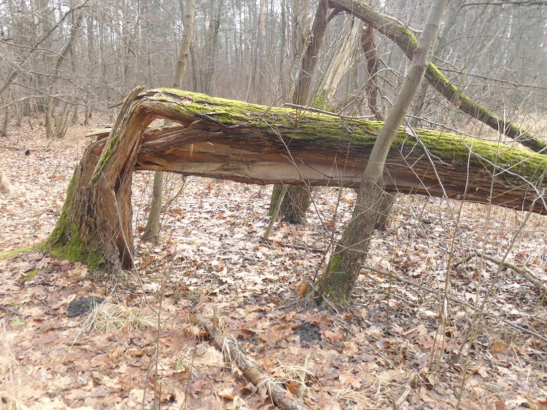 Zaparkowaliśmy w końcu zabudowy, a zarazem asfaltowym końcu ulicy Botanicznej. W tutejszym ogrodzie istnieje zalane zapadlisko. Zalane zapadliska pojawiają się także w pobliskim lesie i to po obu stronach drogi. Tutaj też rozpoczyna się spory akwen zapadliska obecnie zdominowanego przez pałkę szerokolistną oraz trzcinę pospolitą. Wiele dawno temu zaskoczonych drzew już się obaliło. Teraz idąc ku jego północnemu brzegowi, minęliśmy topolę osikę ściętą przez bobra. Przy północnym brzegu natrafiliśmy również na złamaną wierzbę kruchą które pień zasiedlał rokiet cyprysowy. Las pomiędzy tym zapadliskiem a rejonem poszukiwanego źródła ma charakter boru bardzo mieszanego ze względu na znaczną domieszkę dębu czerwonego. Na zachód od źródła las przecina linia energetyczna. Teraz bezdrzewny pas został powiększony. Za nim w drodze do źródła mija się większe połacie brzozy brodawkowatej. Jest także kolejna ogrodzona, czyli ponownie zalesiona poręba. Poza tym w tej partii lasu są okazałe topole i niezbyt wysokie świerki pospolite.