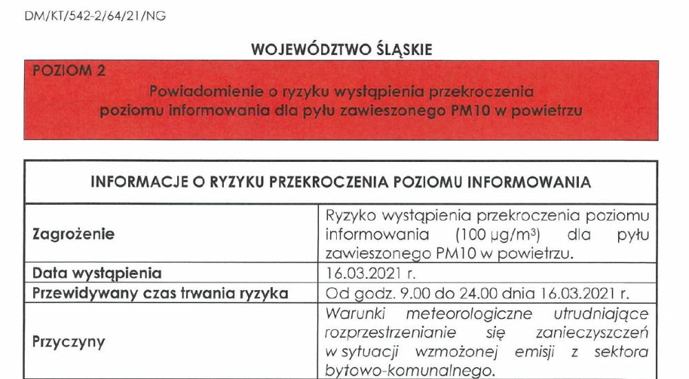 Przekroczenie poziomu zanieczyszczeń powietrza w Jaworznie 16 marca. Jak informuje Powiatowe Centrum Zarządzania Kryzysowego, w woj. śląskim, wliczając Jaworzno, istnieje ryzyko przekroczenia poziomu alarmowego pyłu zawieszonego P10. Z tego powodu został ogłoszony alarm drugiego stopnia.