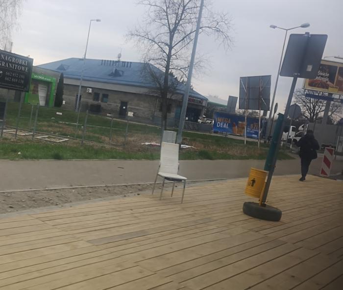 Na tymczasowym przystanku w kierunku centrum miasta stanęło po prostu… krzesło. Zwykłe, może trochę zniszczone, ale wymowne. Jest to zaledwie miejsce dla jednej osoby, ale zawsze coś. W końcu lepiej siedzieć na krześle niż stać i czekać na przykład na spóźniony autobus. Z takiego rozwiązania z pewnością z przyjemnością skorzystają osoby starsze.