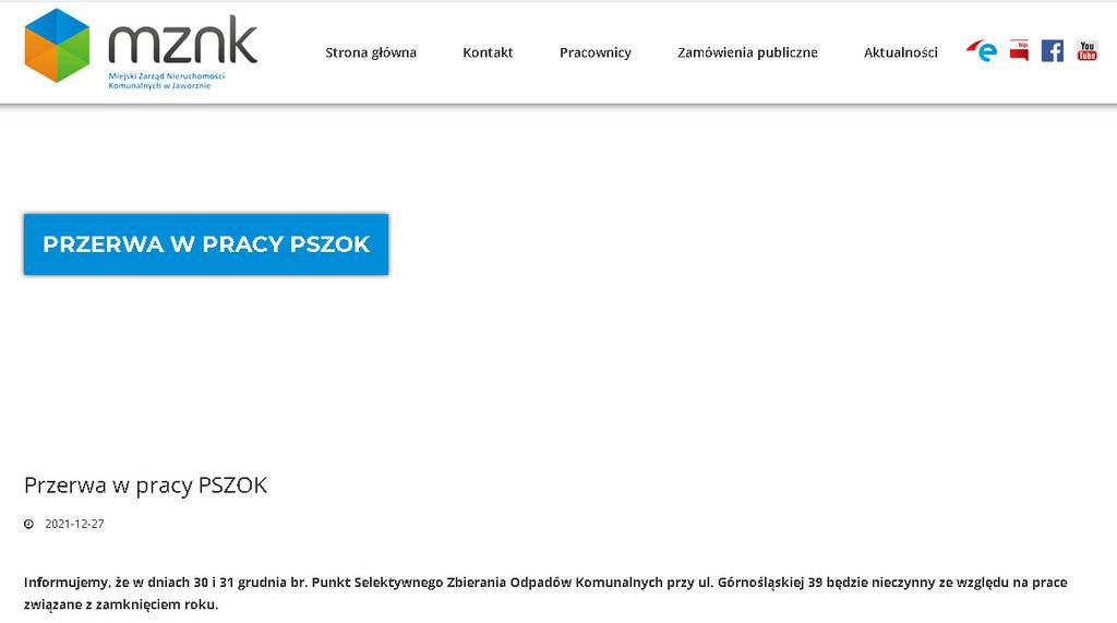 MZNK na swojej stronie internetowej podało do wiadomości publicznej, że w związku z pracami związanymi z zamknięciem roku jaworznicki PSZOK przy ulicy Górnośląskiej 39 będzie nieczynny.