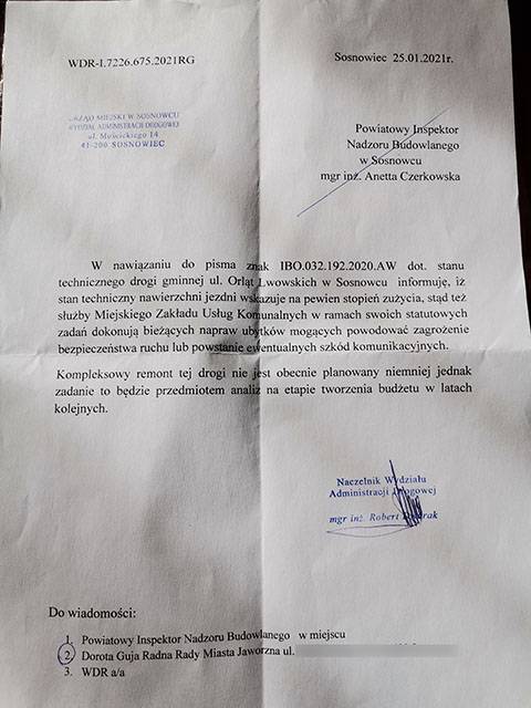 Dorota Guja, radna Rady Miasta w JaworznieW korespondencji do Powiatowego Inspektora Nadzoru Budowlanego w Sosnowcu, Dorota Guja napisała: