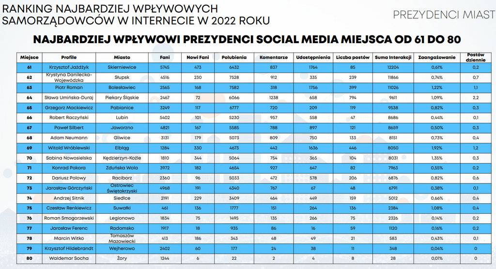 Włodarz naszego miasta zajął odległe 67. miejsce na 80. Ranking bowiem podzielony był na 3 kategorie: Prezydenci miast wojewódzkich, Prezydenci miast oraz Burmistrzowie. Jaworzno rywalizowało oczywiście w drugiej kategorii tj. Prezydenci miast, w której niekwestionowanym liderem okazała się Prezydent Sosnowca Arkadiusz Chęciński, którego wyniki klarują się następująco: fani 46774, nowi fani 3573, polubienia 331683, komentarze 72967, udostępnienia 35901, liczba postów 1323, suma interakcji 545452, zaangażowanie 3,34% oraz liczba postów dziennie 3,6. Wyniki naszego prezydenta wyglądają mniej okazale: fani 4821, nowi fani 167, polubienia 5585, komentarze 788, udostępnienia 897, liczba postów 121, suma interakcji 8659, zaangażowanie 0,50% oraz liczba postów dziennie 0,3.