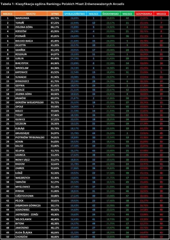 Najbardziej zrównoważone polskie miasta wg rankingu to: