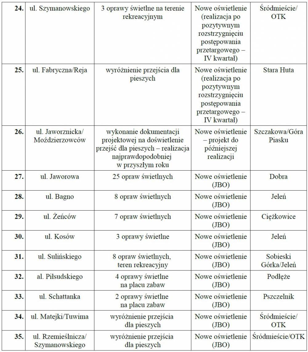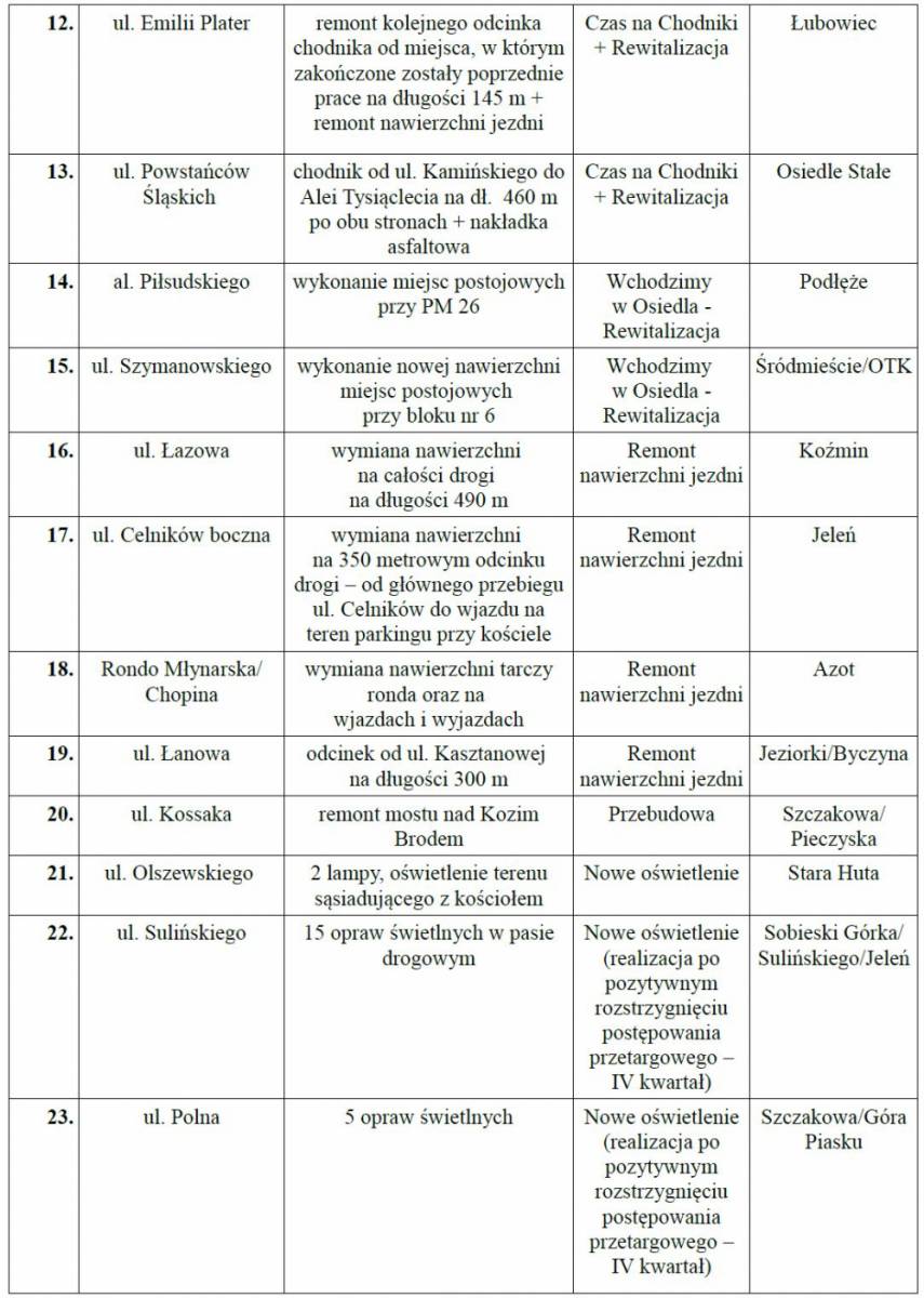 Jako że część prac wykonywana będzie przej jaworznicki MZDiM, a część przez podmioty zewnętrzne, nie są znane dokładne daty ich rozpoczęcia.