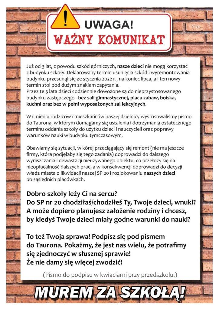 Wiemy już jednak, że i ten termin nie zostanie dotrzymany, gdyż Tauron Wydobycie, który odpowiada za remont budynku SP nr 20 i jego okolic, dopiero przed kilkoma dniami rozpisał przetarg na wykonawstwo robót. Przetarg potrwa do 15 października, a jego zwycięzca będzie miał 9 miesięcy na przeprowadzenie prac od momentu zawarcia umowy.Jeśli jeszcze tego nie zrobiłeś koniecznie zainstaluj naszą aplikację, która dostępna jest na telefony z systemem Android i iOS.