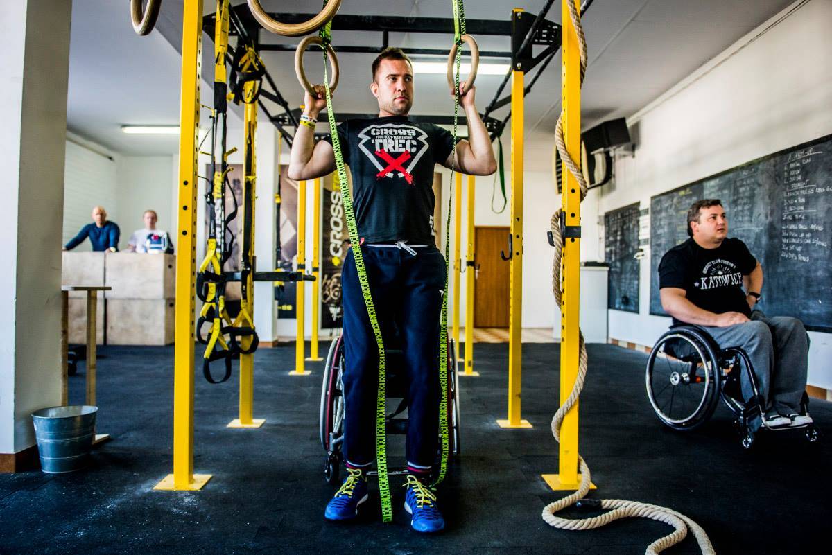 Niepełnosprawny Grzegorz Płonka podnosi się o własnych siłach i wstaje z wózka