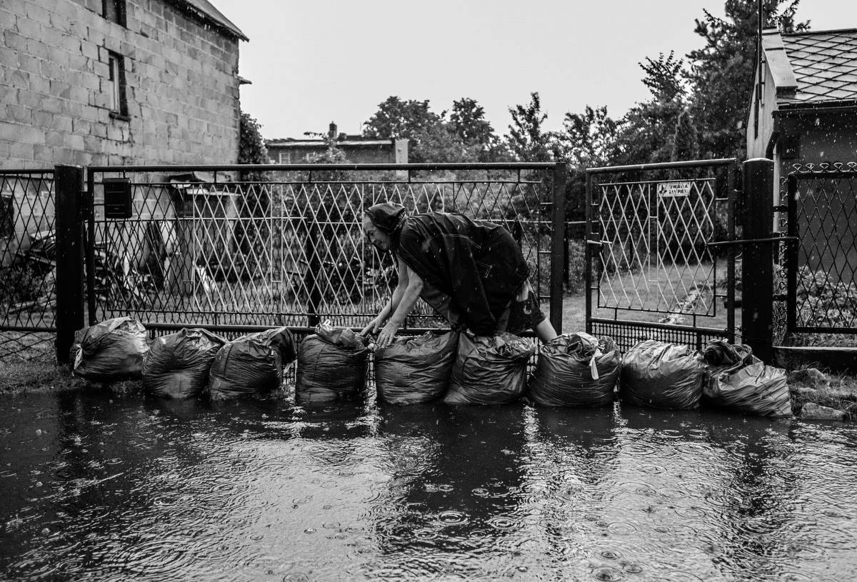 Ul. Starowiejska. Mieszkanka chroni się przed wodą podczas ulewy