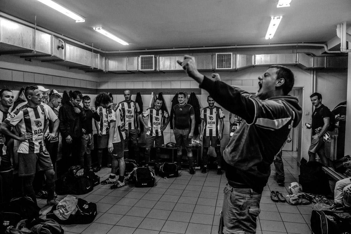 Kibice Victorii 1918 Jaworzno dziękują za awans piłkarzom w szatni po pierwszym meczu rundy jesiennej sezonu 2016/17.