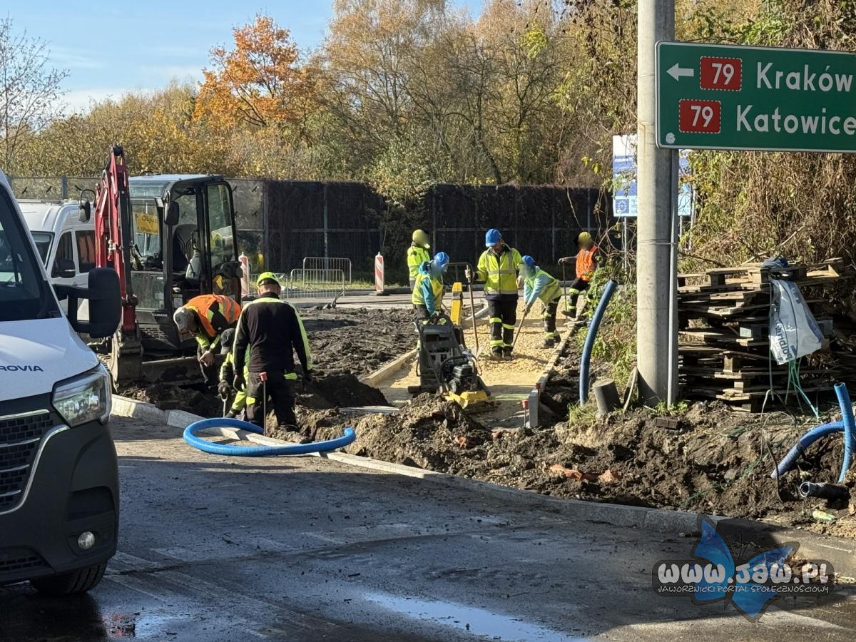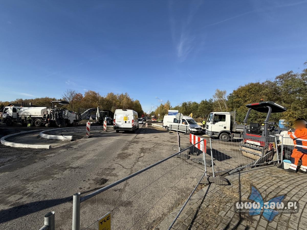 Na skrzyżowaniu alei Jana Pawła II z ulicą Olszewskiego w Jaworznie trwa budowa nowego ronda. Widać już wyraźnie zarys pierwszej połówki na pasie w kierunku Chrzanowa.