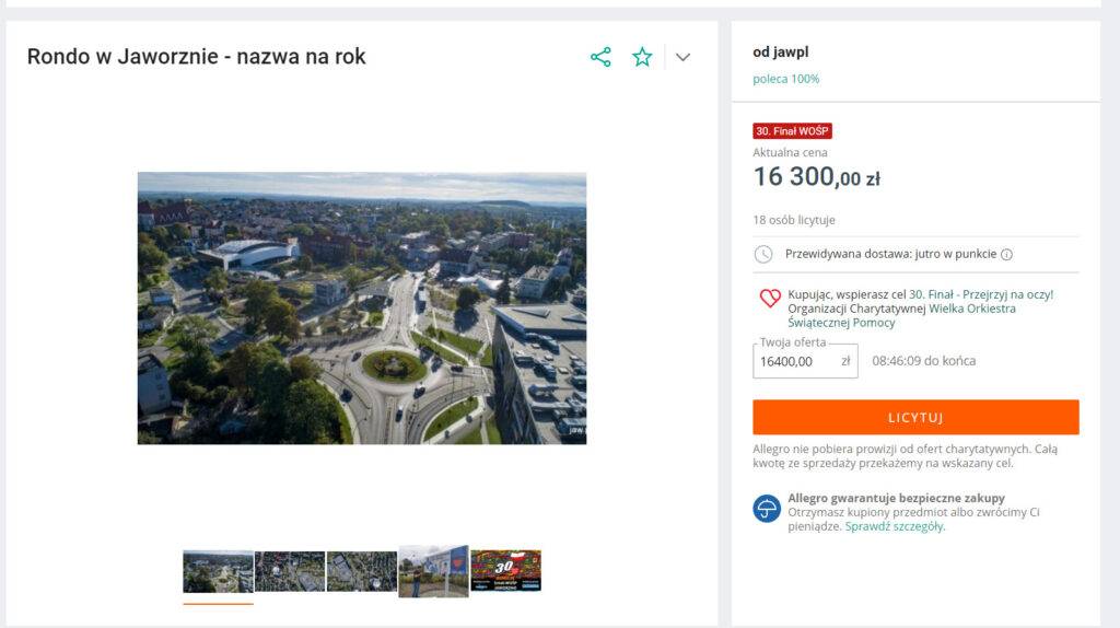 Nazwa ronda Wielkiej Orkiestry Świątecznej Pomocy w Jaworzno co roku jest przedmiotem licytacji na Allegro. W tym roku osiem godzin przed końcem licytacji rondo ma już cenę 16 300 zł i walczy o nie kilka firm.