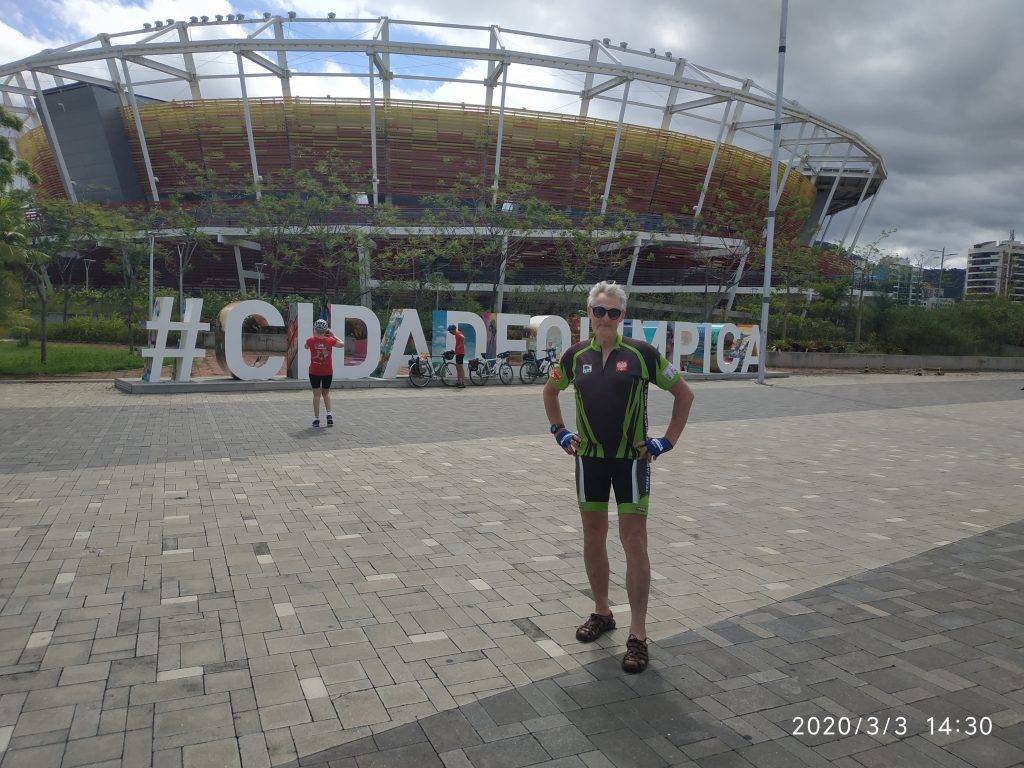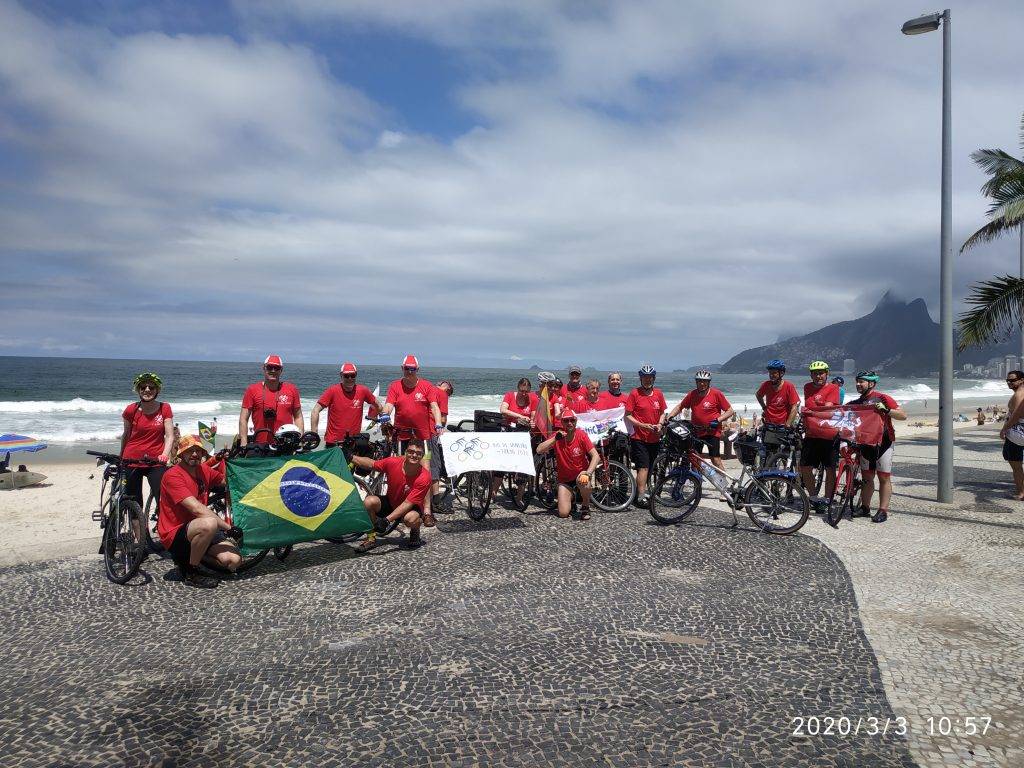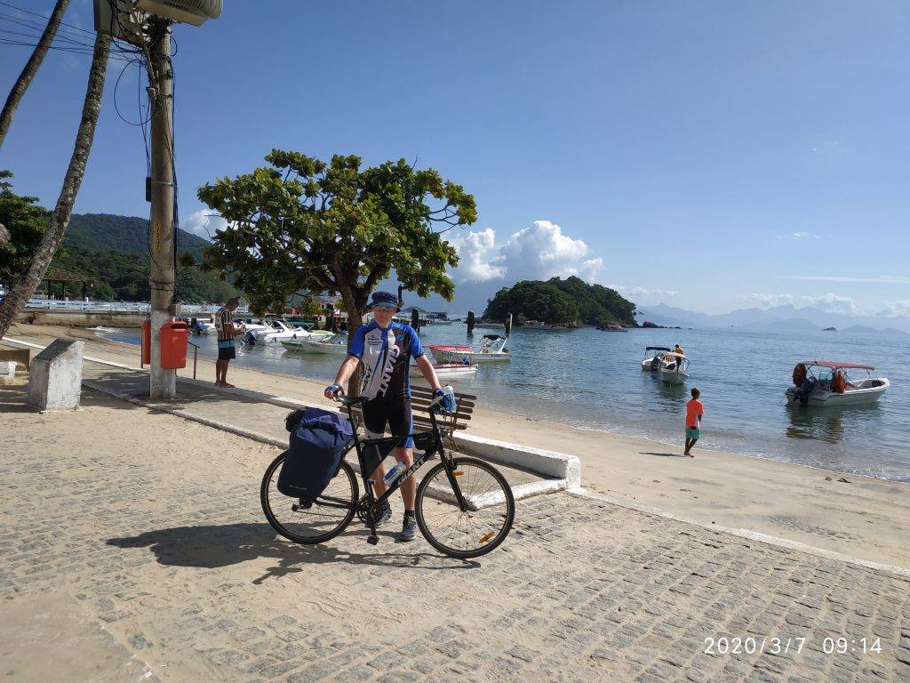 Codzienna odprawa przed wyjazdem na trasę[/caption]Początkowo uczestnicy z poszczególnych krajów trzymali się razem, ale z biegiem czasu zmieniło się i to. Szkot jechał z dwiema Angielkami, pozostali dwaj Anglicy pojedynczo, a Litwini też w różnych konfiguracjach. Jedynie nasza polska grupa jechała konsekwentnie razem. Pierwszego dnia jazdy odwiedziliśmy obiekty olimpijskie. Dzięki wstawiennictwu uczestnika naszej grupy Brazyliczyka Paolo udało się zobaczyć kryty tor kolarski. Cały pierwszy dzień jechaliśmy ścieżką rowerową wzdłuż wybrzeża podziwiając niesamowite widoki. Po przejechaniu 85 km dotarliśmy do miasteczka Barra de Guaratiba, gdzie wysoko na wzgórzu mieliśmy nocleg w kempingu. Samochód bagażowy nie był w stanie dojechać i bagaże musieliśmy wynosić piechotą. Za to widok jaki roztaczał się z kempingu na zatokę był powalający. Drugiego dnia (4.3), jadąc do Mangaratiby nieżle dostaliśmy w kość. Nie dość, że etap dlugi (97 km) i gorzysty, to jeszcze z nieba lał się prawdziwy żar. Temperatura powietrza dochodziła do 40 stopni. Po drodze mieliśmy jeszcze defekt (Łukasz przebił dętkę), a Szkot Bob i dwie Angielki nie mogły trafić na kemping i potrzebna była interwencja samochodu bagażowego. W Mangaratibie spaliśmy na placu przy boisku sportowym