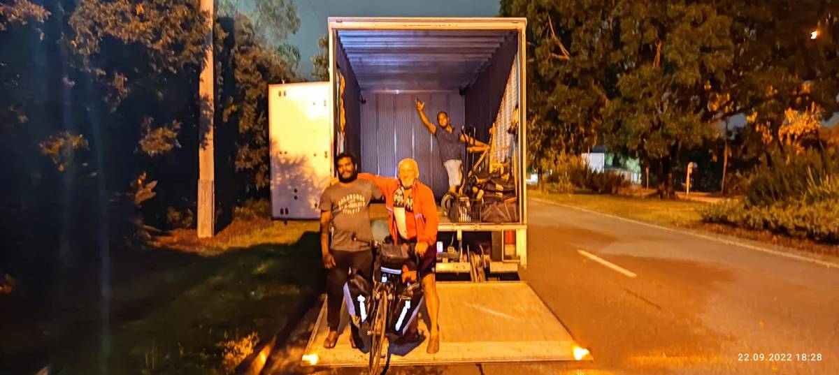 Ruszyliśmy do kolejnej stacji paliw na trasie, odległej o 17 km. Pogoda poprawiła się. Deszczyk ustąpił, wyszło słoneczko. Początkowo nic nie zapowiadało szczęśliwego finału. Kilka samochodów zatrzymało się, ale nikt nas nie zabrał. Minęło południe i miny mieliśmy coraz rzadsze, aż nagle ... zonk. Kolejny raz szczęście uśmiechnęło się do Stanisława. Namierzył samochód do przewozu mebli, który wracał pusty aż za Brisbane. Byliśmy uratowani. Naszym tłumaczem w rozmowie z kierowcami był Łukasz, mieszkający od lat w Australii, który swoją pomoc zaoferował nam wcześniej na FB.