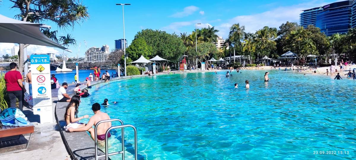 Mostem (William Jolly Bridge) przejechaliśmy na drugą stronę rzeki, a wróciliśmy do City mostem Story Bridge. Jechaliśmy brzegiem rzeki ścieżką wyznaczoną przez fioletowe bugenwille (ozdobne pnącze ogrodowe). South Bank to kompleks parków, restauracji i galerii. Punktem centralnym są darmowe baseny i sztuczna plaża, Street Beach, z delikatnym piaskiem. Palmy kołyszą się na wietrze, a po drugiej stronie wysokie wieżowce przypominają, że mimo tego zrelaksowanego klimatu wciąż jesteśmy w centrum miasta. Od słońca schronić się można także w małym lesie deszczowym. Obok stoi ręcznie rzeźbiona nepalska pagoda. Kawałek dalej jest Epicurious Garden, czyli ogród gdzie można nazrywać świeżych ziół i zobaczyć, jak rosną egzotyczne gatunki — banany, mango, granaty czy baobaby. To na South Banku znajduje się często fotografowany kolorowy znak „Brisbane”, muzeum Queensland Museum ze stałą, darmową wystawą przybliżająca kulturę rdzennych mieszkańców oraz australijską faunę, Galeria Sztuki Nowoczesnej GOMA oraz kompleks teatralny Queensland Performing Arts Centre (QPAC). Tu kręci się także koło widokowe. Dalej ścieżka na Kangaroo Point prowadzi przy wysokich klifach, aż pod charakterystyczny, stalowy most Story Bridge. Na klify można się wspinać. Wspinaczki organizuje firma River Life. Jadąc dalej natrafiliśmy na kompleks restauracji Howard Smith Wharves. Oprócz barów i resauracji są też przestrzenie do wynajęcia na prywatne imprezy. Zmęczeni, ale zachwyceni wracamy do hostelu przy którym spędzamy kolejną noc w mieście, oczekując na przyjazd pozostałych uczestników wyprawy.