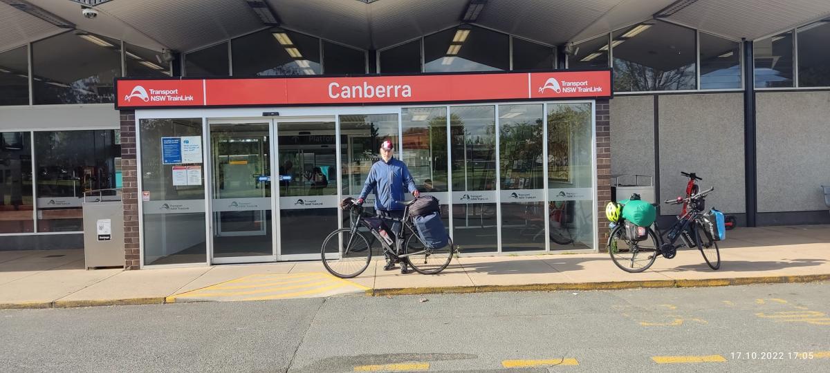 Z Sydney do Canberry (ok. 300 km) jedziemy dwoma pociągami, bo jeden pociąg może zabrać tylko 3 rowery. Pierwsza grupa pojechała rano o 7:12, druga w południe o 12:01. Po 4 godzinach jesteśmy w stolicy. Rowery jechały zapakowane w pudła kartonowe, takie w jakich dostarczane są do sklepów rowerowych. Ciężar pudła z rowerem nie może przekraczać 20 kg. Za przejazd pociągiem płaciliśmy ok. 190 zł.