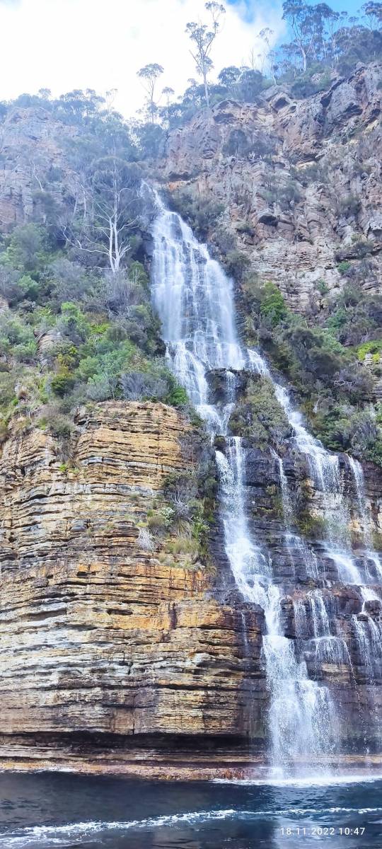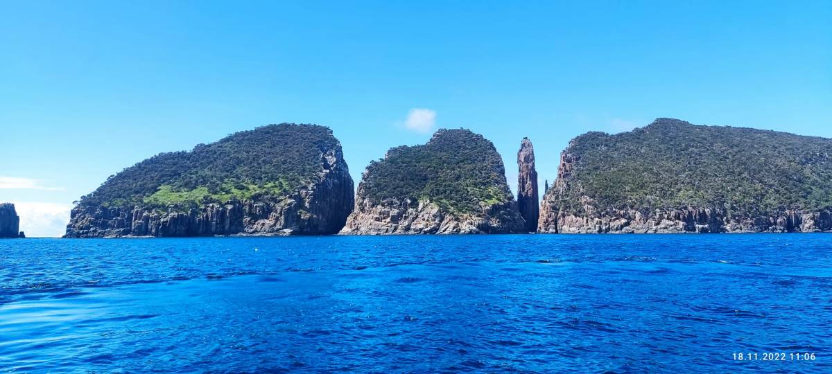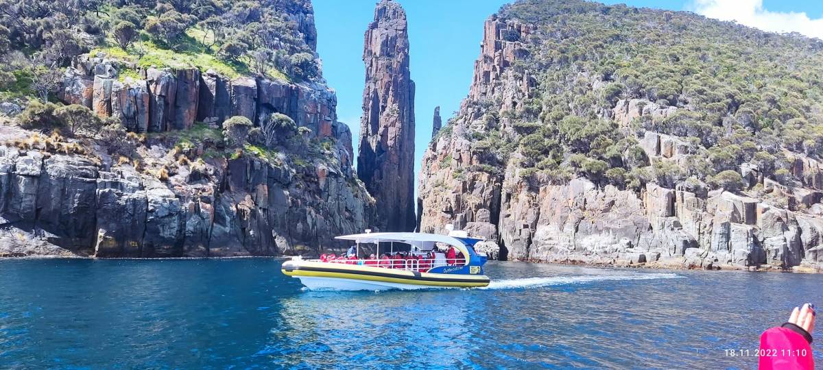 Dziś musieliśmy wstać wcześniej niż zwykle, bo o 6:30 zarządzono wyjazd do odległego o 150 km od Swansea miasteczka Port Arthur, gdzie mieliśmy zarezerwowaną wycieczkę statkiem wzdłuż wybrzeża, które jest częścią Parku Narodowego Tasman. W czasie 2-godzinnego rejsu 40-osobowy stateczek płynął pod najwyższymi pionowymi klifami morskimi na półkuli południowej w Cape Pillar. Mogliśmy z bliska podziwiać formacje skalne, wodospady, łuki i jaskinie głębinowe i wygrzewające się na słońcu rodziny fok.