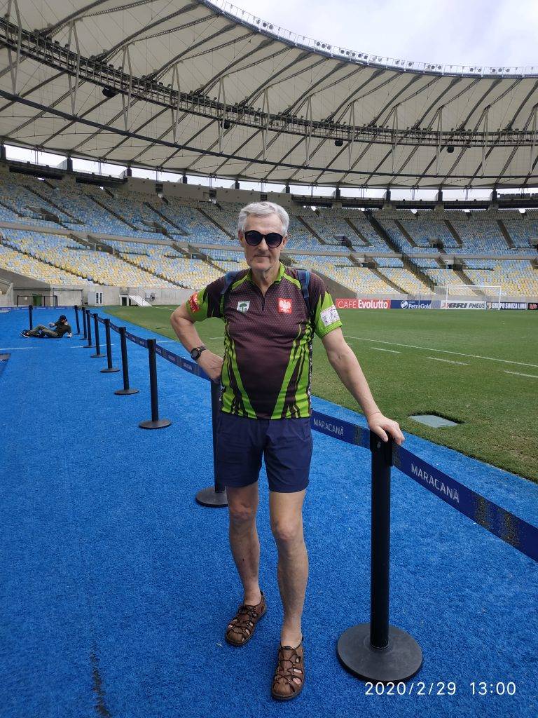 W tle legendarny stadion piłkarski Maracana[/caption]Przed paradą na Sambodromie pojechaliśmy metrem na pobliski legendarny stadion piłkarski Maracana, gdzie mieliśmy okazję zwiedzić muzeum historii brazylijskiej piłki nożnej oraz wejść na trybuny kultowego stadionu. Zbudowany na mistrzostwa świata w piłce nożnej, w 1950 roku stadion był największym tego typu obiektem na świecie. Zasiadało na nim 200 tysięcy widzów. Obecnie, po przebudowie jego pojemność wynosi ok. 70 tysięcy. Wracając piechotą ze stadionu Maracana spotkało nas przykre zdarzenie. Podczas przchodzenie przez plac wypełniony różnobarwnym tłumem koledze Maciejowi skradziono telefon komórkowy, metodą "na wyrwę". Podczas wykonywania przez kolegę zdjęć podbiegł jakiś młody człowiek i dosłownie porwał mu z ręki telefon. W ym samym czasie próbowano taki sam manewr z kolegą Grześkiem, a także ze mną. Na szczęście trzymałem telefon mocno i kradzież nie udała się.
