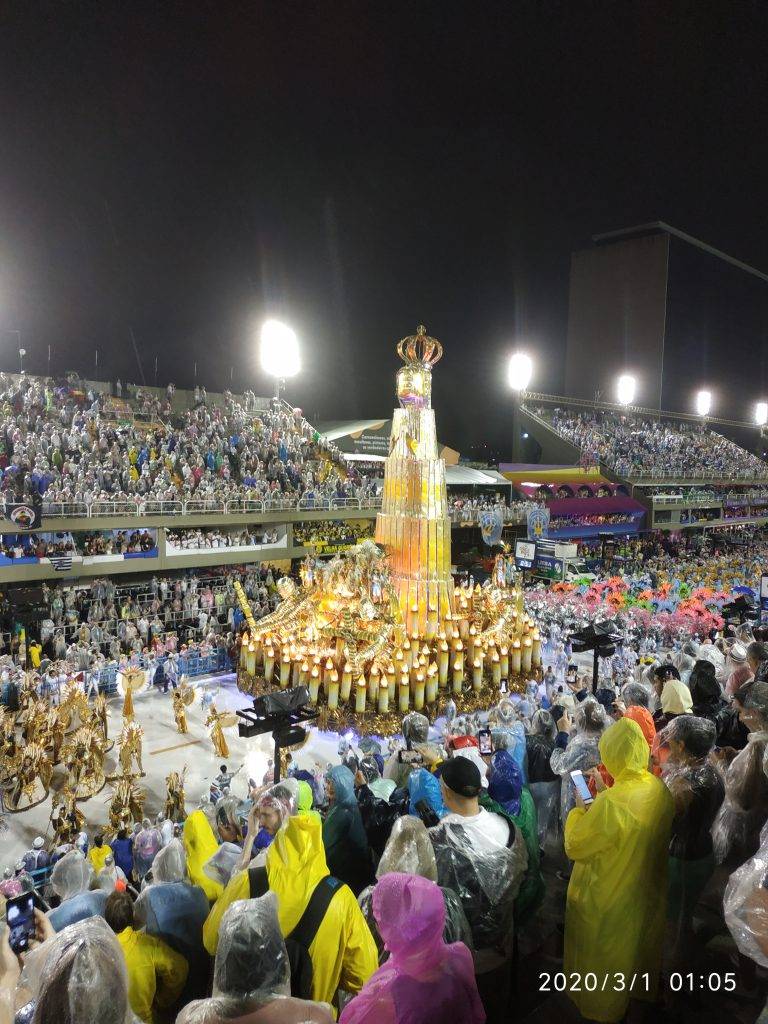 Statua Chrystusa Zbawiciela - symbol Rio[/caption]Kolejką linową wjechaliśmy na Głowę Cukru (Pao de Acucar), granitowe wzgórze o wys. 396 m n.p.m, o charakterystycznym, kopułowatym kształcie, z ktorego roztacza się imponujący widok na miasto. Nie omieszkaliśmy również odwiedzić owianej legendarną sławą 4,5-kilometrowej plaży Copacabana, otoczonej licznymi hotelami i restauracjami. Nieopodal słynnej plaży, w hotelu Arena wymieniliśmy zakupione przez internet bilety na Paradę Zwycięzców - na oryginalne foliowane "fiszki" (52 $). Najważniejszym dniem naszego pobytu w Rio była sobota, 29 lutego. Tego dnia od godz. 20-tej, na specjalnie przeznaczonym do tego Sambodromie, odbyła się całonocna Parada Zwycięzców - przemarsz szkół samby - kulminacyjny punkt karnawału w Rio.