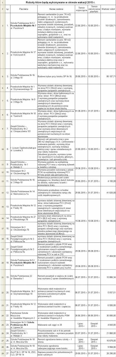 W tym roku takich zadań przewidziano 27 na kwotę ponad 1,5 mln zł, z czego ponad 780 tys. zł to zadania związane z Jaworznickim Budżetem Obywatelskim. Największy zakres prac przewidziano w Szkole Podstawowej nr 5/Przedszkolu Miejskim nr 7 przy ul. Puszkina, Przedszkolu Miejskim nr 17 przy ul. Kościuszki oraz w I Liceum Ogólnokształcącym. W liceum rozpoczął się remont sali gimnastycznej, który obejmuje między innymi cyklinowanie i malowanie parkietu, wymianę drzwi, instalacji elektrycznej i opraw oświetleniowych oraz roboty malarskie. Ta informacja szczególnie powinna ucieszyć uczniów, którzy musieli korzystać ze zniszczonej sali. Prace nad salą mają zakończyć się 10 sierpnia.