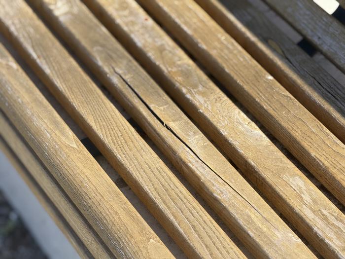 Skwer św. Teresy przy ulicy Długiej na Dąbrowie Narodowej został ukończony w ubiegłym roku, ale już dziś wymaga naprawy. Ławki przetrwały zaledwie jedną zimę, a na drewnie wyraźnie widać ślady zużycia - popękane deski i pościerana warstwa lakieru. Zniszczone są również ławki w stylu Hundertwassera.