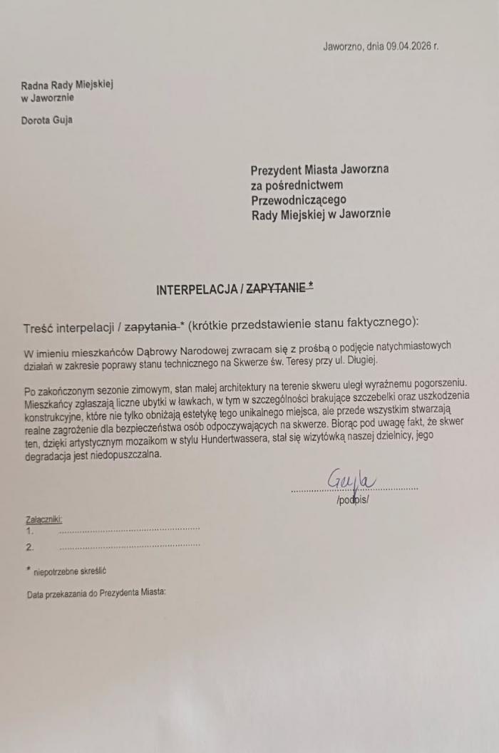 W sprawie zniszczeń i zużyć elementów skweru radna Dorota Guja wystosowała również oficjalną interpelację do Urzędu Miejskiego w Jaworznie.