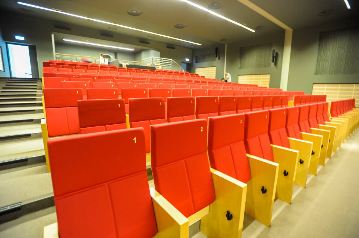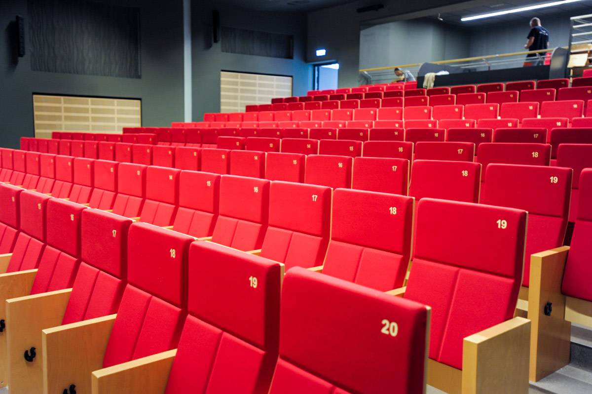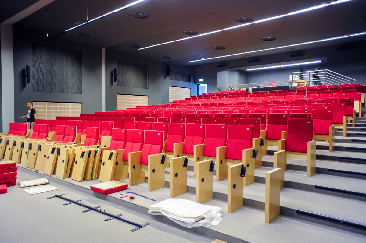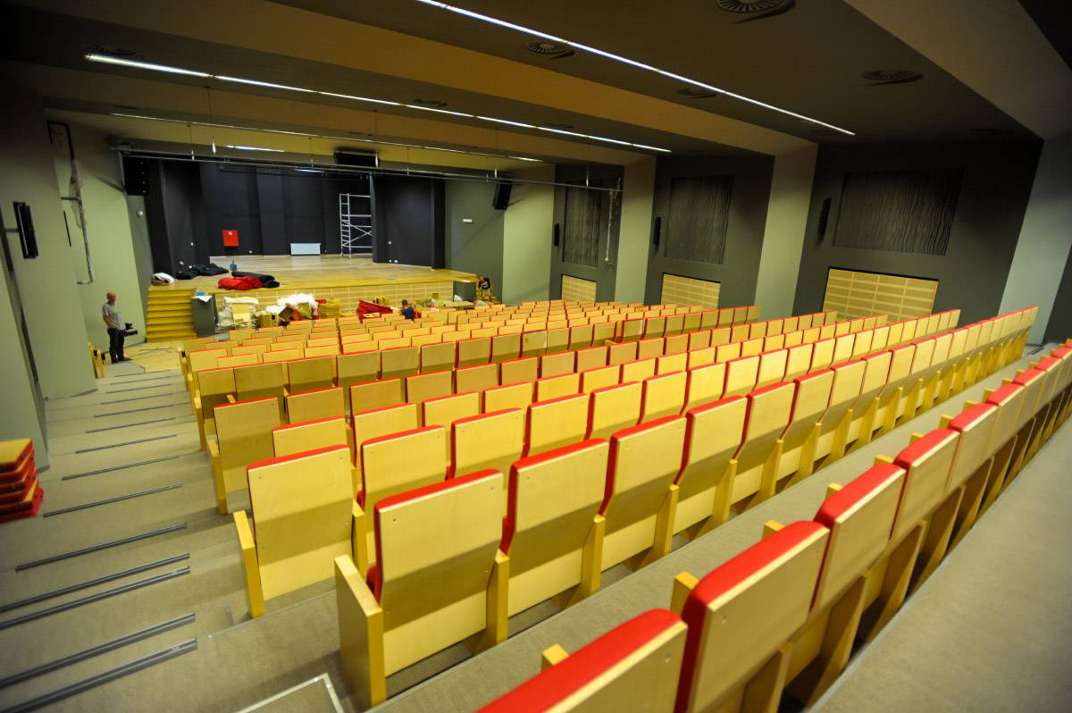 Sala jest dosyć duża i pomieści około 350-400 osób. Zamontowano już czerwone fotele, przygotowano również scenę. Zamontowano również podświetlenia schodów po obydwu stronach widowni oraz balustrady zabezpieczające balkon, którego wcześniej nie było.