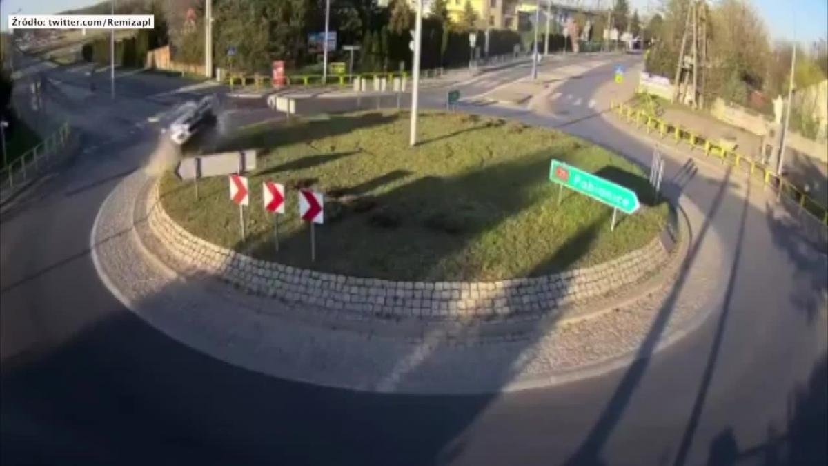 Rozpędzony samochód po wjechaniu na rondo wyskoczył w powietrze i złamał drzewo na wysokości 7 metrów.