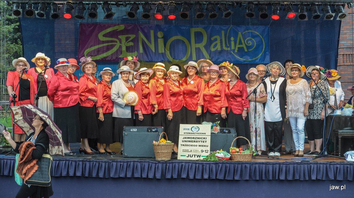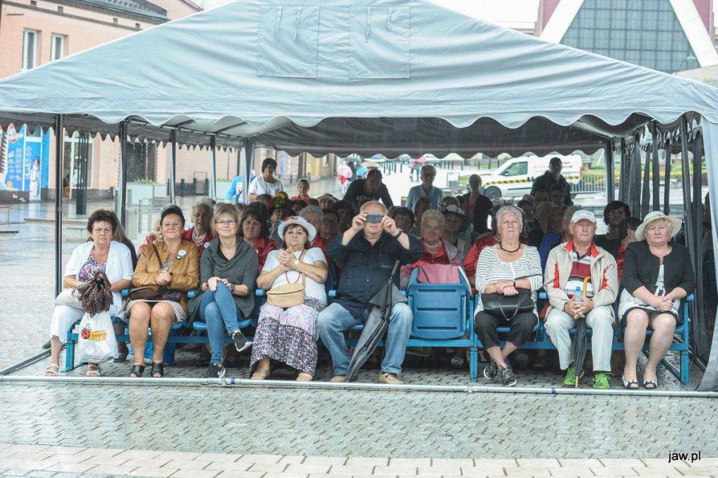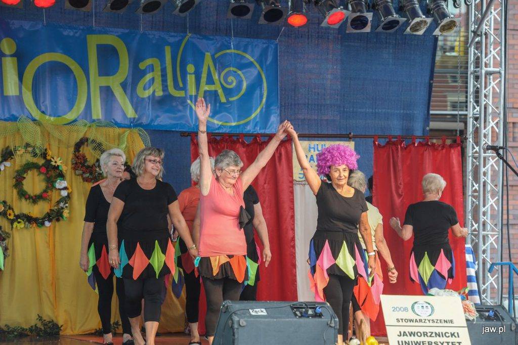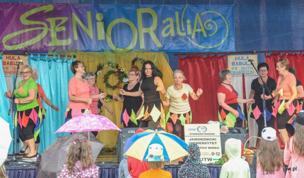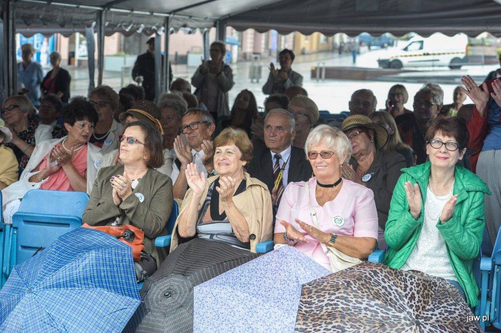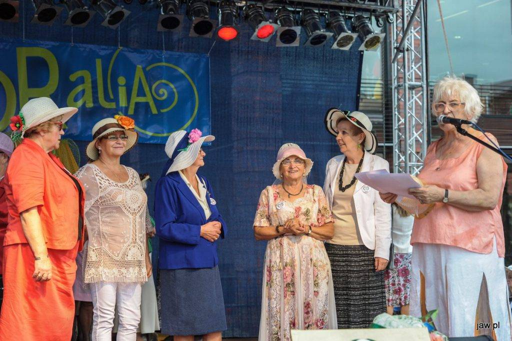 Mili seniorzy i przyjaciele zgromadzili się w deszczową sobotę na jaworznickim Rynku, tym głównym. Imprezę nazwano Senioralia na wesoło z Jaśnie Panem Kapeluszem, częśc pań seniorek pojawiła się więc w ozdobnych kapeluszach. Na scenie prezentowały się m.in. panie tańczące pod okiem Katarzyny Nieużyły z Teatru Sztuk w układzie pt. Pokaz mody.