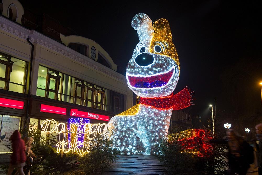Od 2017 roku w grudniu na skwerku nieopodal ulicy 11 Listopada, w ścisłym centrum Bielska-Białej pojawia się niezwykła ozdoba. Mowa o 5-metrowej aluminiowej figurze przedstawiającej najsłynniejszego psiego bohatera polskich kreskówek – Reksia. W tym roku konstrukcja również powróciła na plac. Wybór był nieprzypadkowy - psiak stanowi jeden z symboli miasta. Podobnie jak Bolek i Lolek został on stworzony w Studiu Filmów Rysunkowych, które w 1945 roku założone zostało właśnie w Bielsku-Białej. Figura wyposażona została w fotokomórkę, która aktywuje efekty dźwiękowe w momencie, gdy do Reksia zbliżają się przechodnie. Piesek szczeka zupełnie jak w bajce, merda ogonem, a wraz z zapadnięciem nocy rozświetla się tysiącem lampek, które sprawiają, ze figurę widać z daleka. Do wykonania ozdoby ADAL wykorzystał matę holograficzną, węża oraz łańcuch LED.