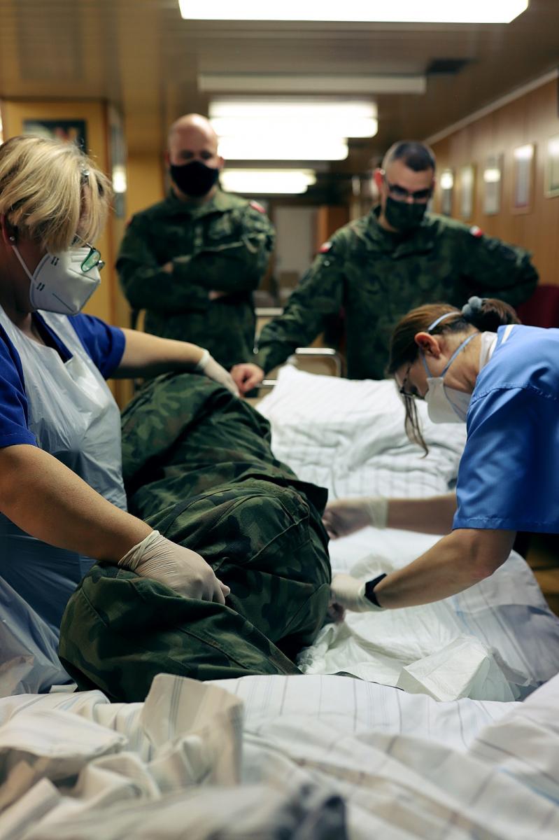 Śląscy terytorialsi przechodzą szkolenie z opieki nad pacjentami leżącymi. Celem szkolenia jest wsparcie personelu medycznego