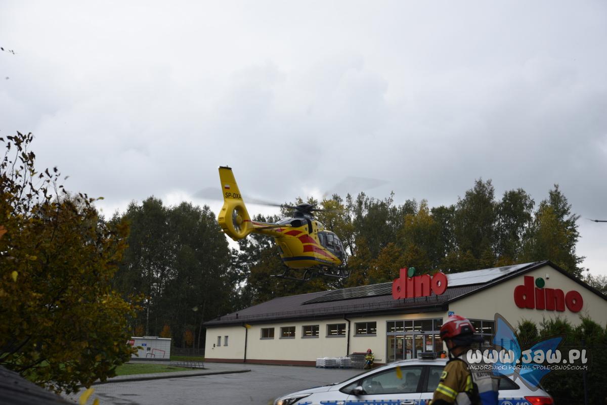 Mężczyzna doznał poważnego urazu ręki. Zdecydowano więc o wezwaniu śmigłowca, który wylądował na parkingu sklepu przy ulicy Katowickiej w Dąbrowie Narodowej w Jaworznie.