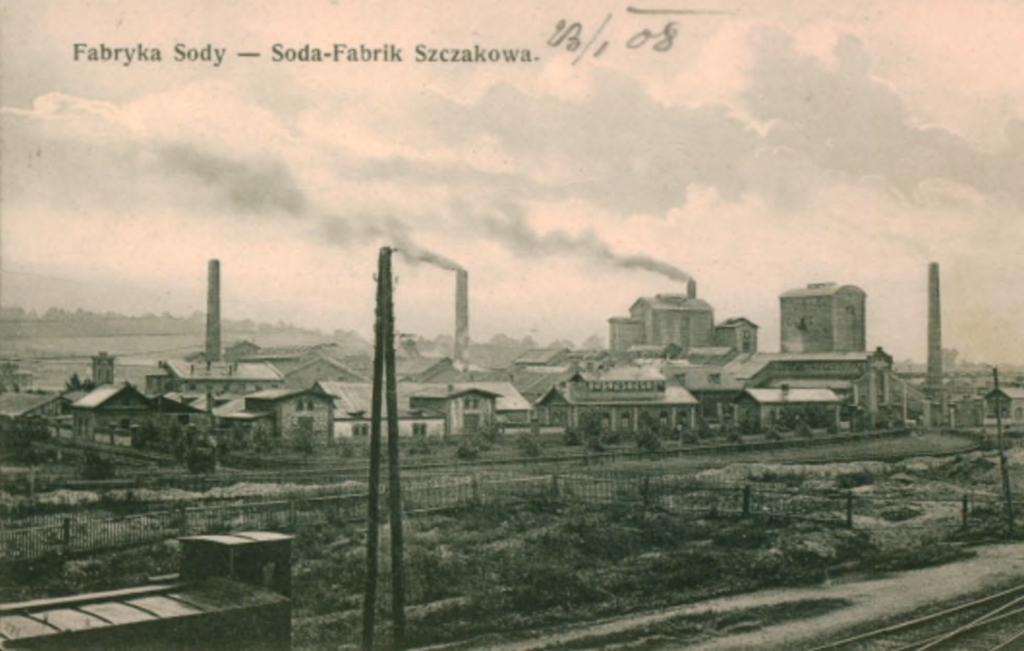 Pocztówka z widokiem Fabryki Sody Amoniakalnej w Szczakowej ~1908 rok (źródło: Śląska Biblioteka Cyfrowa | https://www.sbc.org.pl/dlibra/publication/137772/edition/129307/content).[/caption]