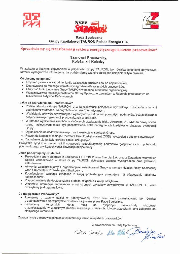 Odnosząc się do podejmowanych działań, związkowcy informują pracowników, że obecnie prowadzi spory zbiorowe z zarządem Taurona Polska Energia oraz reszty spółek wchodzących w skład Grupy Tauron celem uzyskania gwarancji wzrostu wynagrodzeń i zatrudnienia. Związkowcy dodają, że w razie niepowodzeń powyższych działań, przygotowują się do zaostrzenia protestu ze strajkiem włącznie.