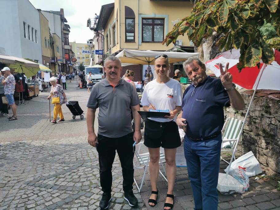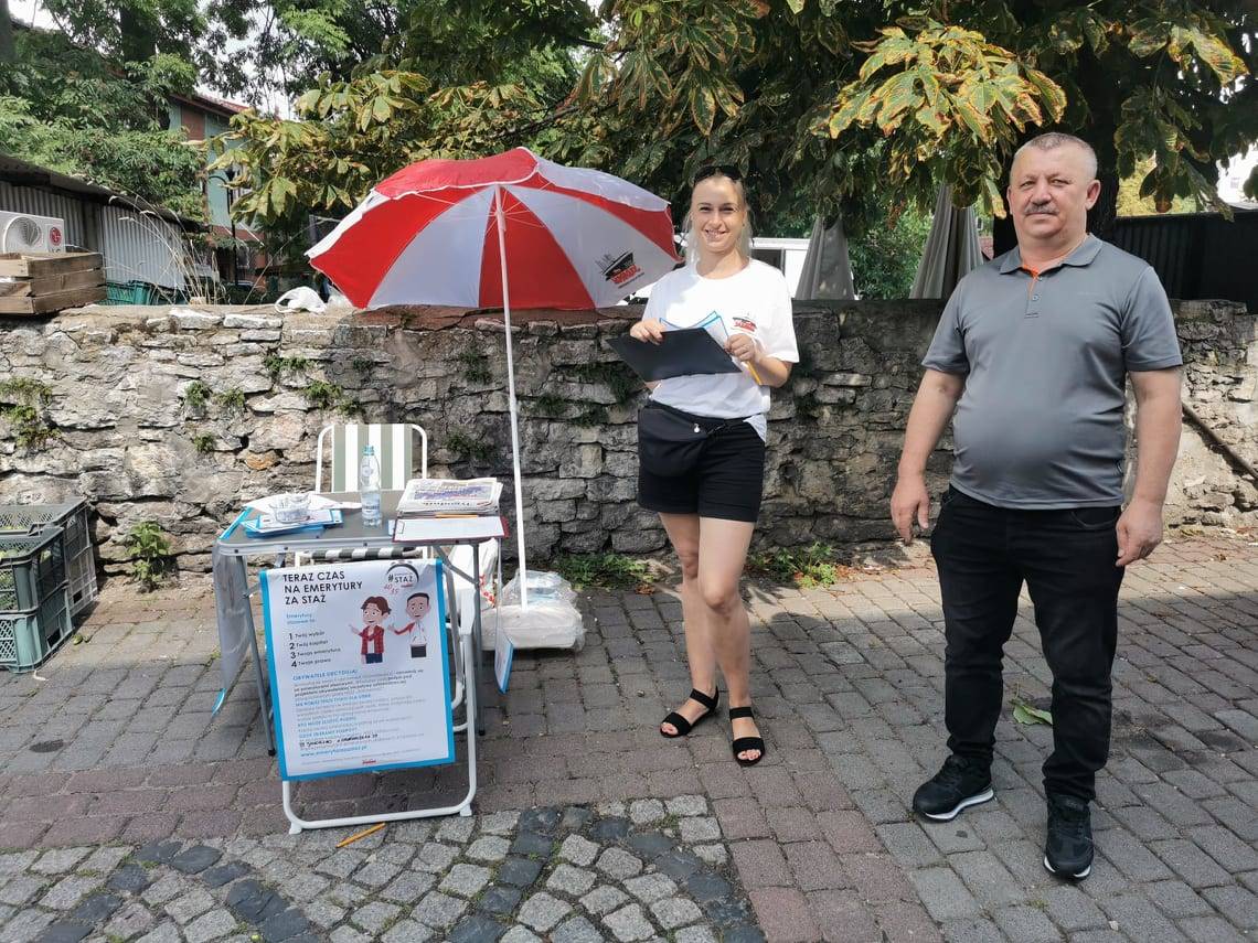 Solidarność zbiera na ul. Kociej w Jaworznie podpisy pod obywatelskim projektem obniżenia wieku emerytalnego poprzez wprowadzenie tzw. emerytur stażowych.