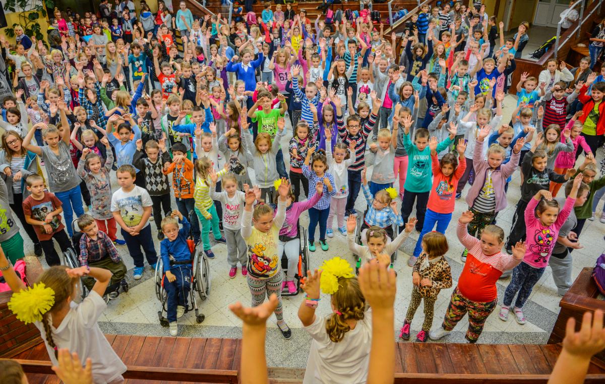 Równo o godzinie 10:35 rozbrzmiewa dzwonek na przerwę i hol wypełnia się dziećmi w każdym wieku. Dokładnie wiedzą co to oznacza – już za chwilę z głośników popłynie rytmiczna muzyka, a oni zrelaksują się podczas tańca. We wtorek w szkole panowały klimaty zumby. Układ tańca przygotowały dzieci z klasy integracyjnej 3a. Około 200 osób zgromadzonych w holu naśladowało pokazywany taniec, świetnie się przy tym bawiąc.