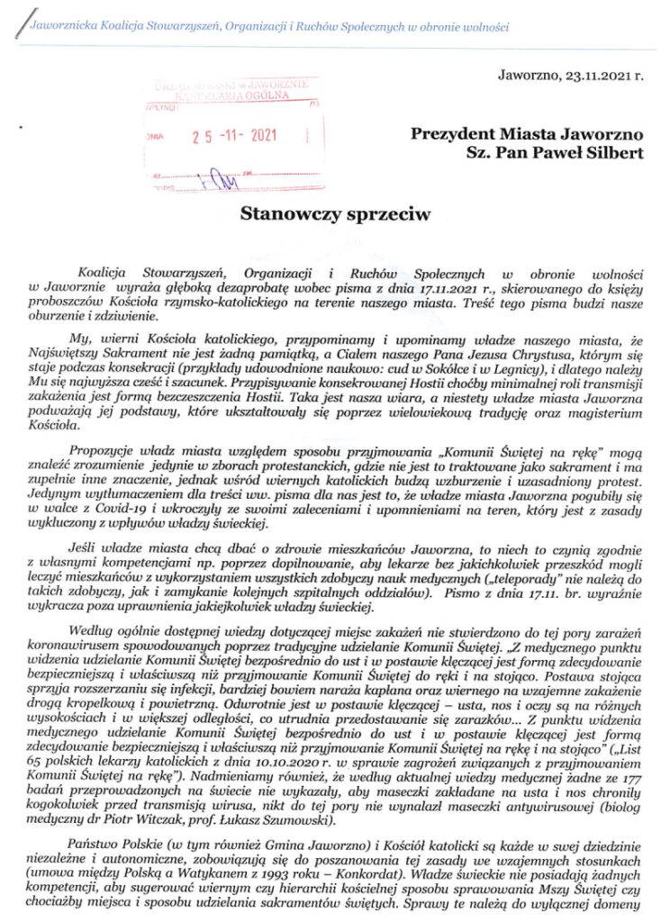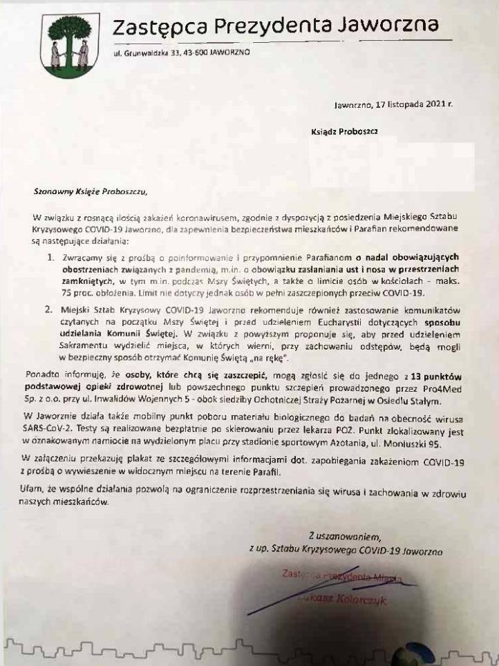 Intencją informacji Miejskiego Sztabu Kryzysowego COVID-19 - kierowanych m.in. do organizacji, instytucji, zakładów – a w ostatnim przypadku również do Proboszczów jaworznickich parafii, była i jest wyłącznie troska o zdrowie i życie ludzi. List z 17 listopada 2021 r. nigdy nie miał charakteru nakazowo-wykonawczego – Miejski Sztab Kryzysowy nie ma takich uprawnień ani też nie rości sobie kompetencji organów uprawnionych do wydawania decyzji dot. życia duchowego.