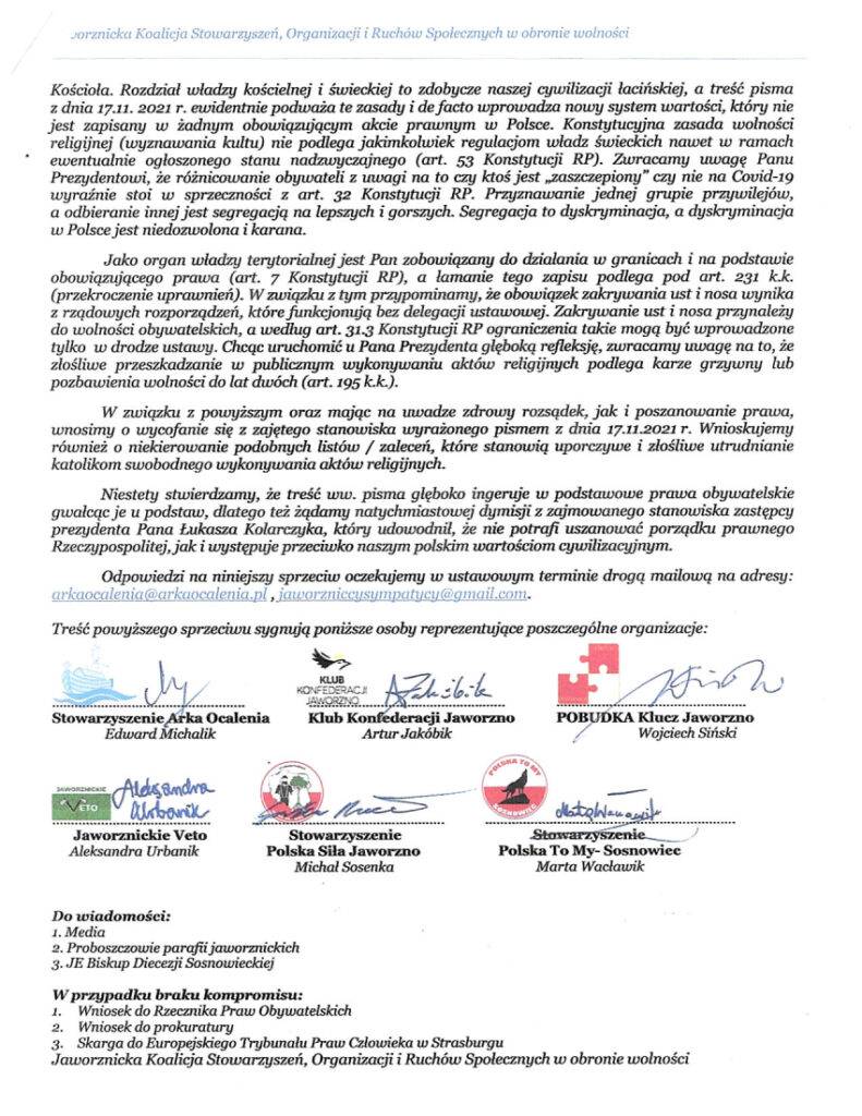 Pismo nie może być interpretowane ponad to, co jest w nim zawarte, tym samym rzeczony dokument jest wyłącznie tekstem z propozycjami, rekomendacjami, sugestiami i wskazaniami (zgodnymi z normami ogólnopolskimi). Doszukiwanie się w nim treści nieistniejących narusza jedyną i nadrzędną intencję, tj. uwrażliwianie społeczeństwa na ograniczanie rozprzestrzeniania się koronawirusa, ograniczanie zachorowań i – przede wszystkim – wspólną troskę o zdrowie i życie ludzi mieszkających w Jaworznie (bądź je odwiedzających)”.