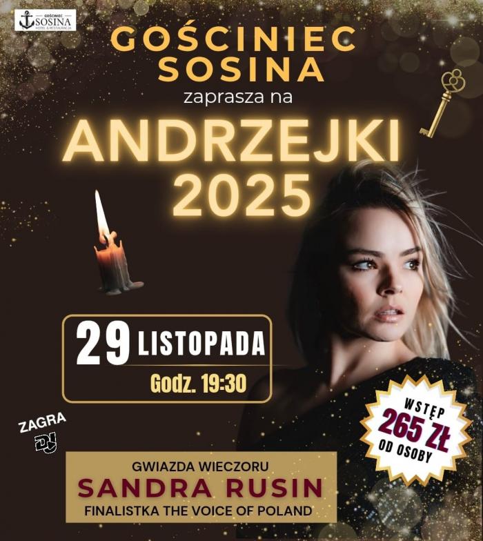 Andrzejki w Jaworznie. Koncert Sandry Rusin - finalistki The Voice of Poland, elegancka sala bankietowa, taneczny klimat, wyśmienita kuchnia i malownicze otoczenie. Czego chcieć więcej? Magia Andrzejek to nie tylko wróżby i tajemnicza aura, ale także świetna zabawa w wyjątkowej oprawie. W tym roku niezapomnianą noc andrzejkową zagwarantuje Gościniec Sosina w Jaworznie.