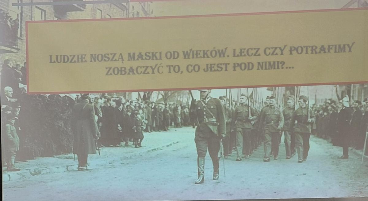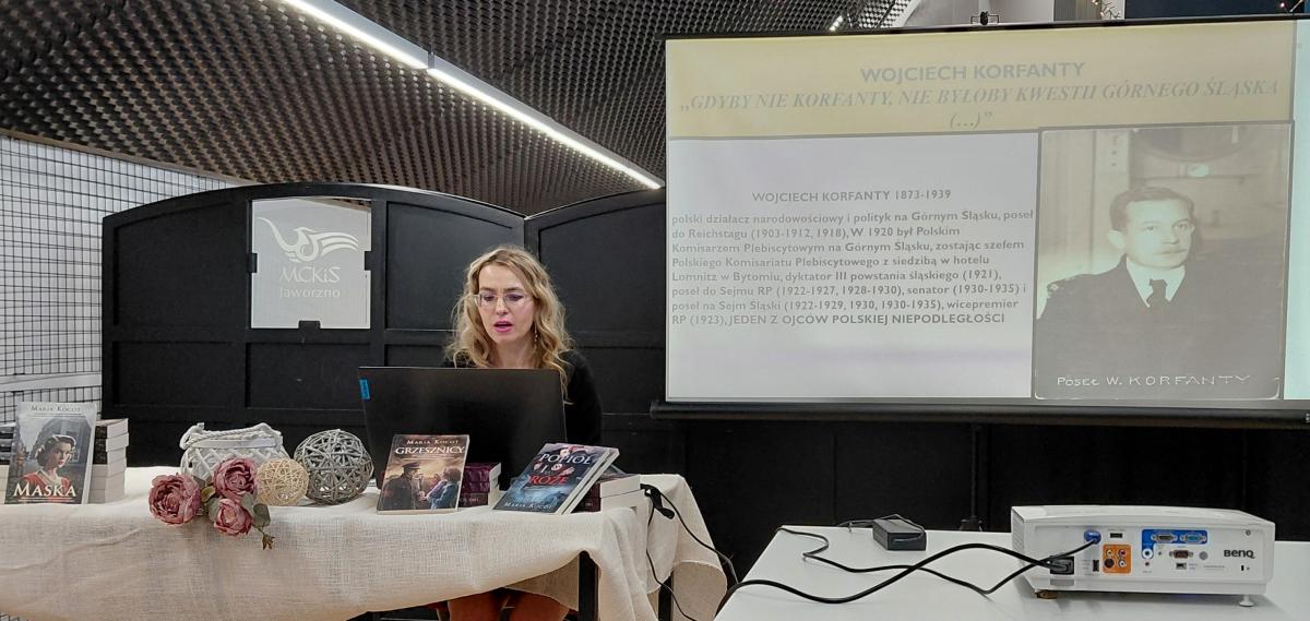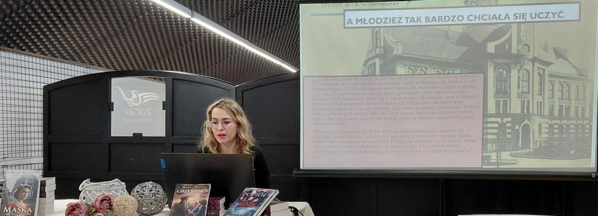 Opowiedziała niezwykle zagadkowo o czym jest książka. Na slajdach zobaczyliśmy miasto: Beuthen 1938. Z tego miasta wyruszyli jej fikcyjni bohaterowie, w trudne życie uwarunkowań historycznych. Przewijały się na ekranie postacie prawdziwe: Korfanty, Marta Eggerth, Karin Stanek osadzone w powieści. Pisarka tak mówiła o fabule swojej najnowszej książki, że rozbudziła w słuchaczach niegasnącą ciekawość.
