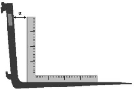 Może się też zdarzyć tak, że operator nieświadomie przeciąży wózek, co może skutkować wygięciem wideł, dlatego kolejny pomiar jaki wykonujemy to zmierzenie kąta wideł. Kąt między pionową a poziomą częścią wideł (α) nie powinien być większy niż 3° względem fabrycznej rozpiętości.