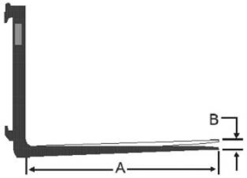 Ostatnim pomiarem jakiego powinniśmy dokonać, to sprawdzenie nożycowości wideł. Aby to zrobić, najpierw musimy przesunąć widełki do siebie – albo za pomocą elementu sterującego widłami, albo zrobić to ręcznie, jeżeli wózek nie możliwości rozstawu wideł z poziomu kabiny wózka. Gdy mamy już widełki w bliskiej odległości obok siebie, to na wysokości ok. jednego metra przejeżdżamy stopą po nich. Gdy poczujemy jakiś przeskok z jednej widełki na drugą, wartość ta (B) nie może przekraczać 2cm.