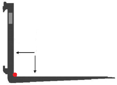 Często zdarza się również, że operator rozpoczyna jazdę wózkiem z widełkami położonymi na gruncie, i dopiero po chwili je podnosi do góry. Takie działanie skutkuje wycieraniem się od spodu poziomej części wideł. Dokonując oględzin wózka, powinniśmy zatem sprawdzić poziom tego wytarcia. Wykonujemy pomiaru pionowej i poziomej części wideł w punkcie ok. 5-15cm (strzałki) od pięty wideł (czerwona kropka). Różnica między tymi pomiarami, grubościami, nie może być większa niż 10%, ale też nie większa niż 5mm. Kursanci podczas egzaminu przeprowadzanego w celu zdobycia uprawnień często natrafiają na pytanie: ile wynosi minimalna dopuszczalna grubość poziomej części wideł, przy grubości nominalnej (pionowej) 40mm? Należy policzyć to w sposób następujący: jeśli grubość pionowej części wideł wynosi np. 40mm, to 10% z 40=4, zatem 40-4=36mm. W związku z tym poprawna odpowiedź na to pytanie brzmi: Minimalna dopuszczalna grubość poziomej części wideł wynosi 36mm.