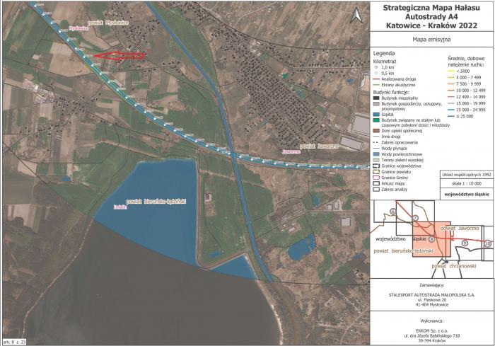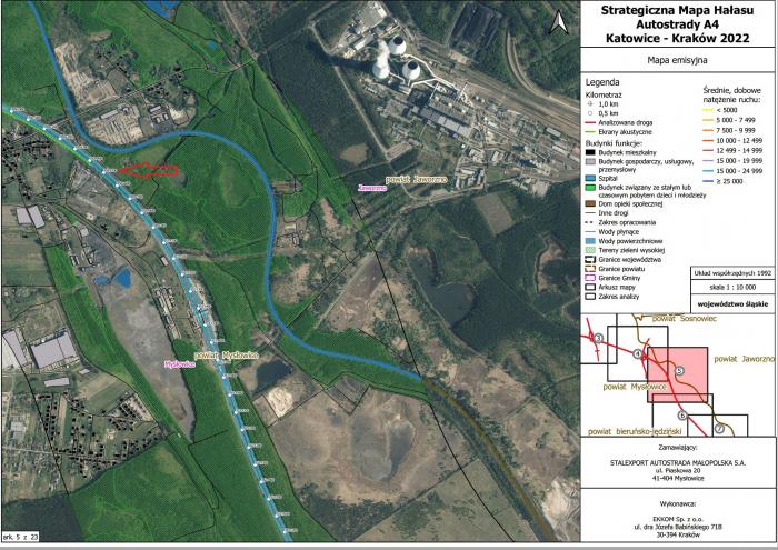 we wskazanym rejonie istnieje ekran akustyczny. Zgodnie z decyzją Wojewody Katowickiego o ustaleniu lokalizacji autostrady płatnej nr 2/96 z dnia 8 października 1996 r., znak: Ar.III/1-3/7331/2/96, w części określającej warunki wynikające z potrzeb ochrony środowiska, Wojewoda ustalił zasięg ponadnormatywnego oddziaływania autostrady na środowisko i określił jako III strefę uciążliwości pas o szerokości 150 m licząc od skraju korony drogi, na której niedopuszczalna jest lokalizacja obiektów przeznaczonych na stały pobyt ludzi (ust. II, pkt. 4.8.1.3. ww decyzji). Ponadto, biorąc pod uwagę w/w strefę uciążliwości, nie znajdowały się tam tereny podlegające ochronie akustycznej. Jednocześnie informujemy, że Koncesjonariusz realizuje działania mające na celu ograniczenie hałasu drogowego zgodnie z Programem ochrony środowiska przed hałasem dla Województwa Śląskiego przyjętym uchwałą nr VII/3/4/2024 z dnia 10 czerwca 2024 r. Program ten został wykonany przez firmę LEMITOR Ochrona Środowiska Sp. z o.o. sp. k. z Wrocławia (dalej jako LEMITOR) na zlecenie Urzędu Marszałkowskiego Województwa Śląskiego oraz stanowi akt prawa miejscowego. LEMITOR jako podmiot niezwiązany z Koncesjonariuszem wykonał swoje prace badawcze i analityczne niezależnie. W Programie nie stwierdzono konieczności budowy lub modyfikacji zabezpieczeń przeciwhałasowych w opisanym rejonie. Informujemy również, że w 2022 roku, zgodnie z obowiązującymi przepisami z zakresu ochrony środowiska, SAM wykonała Strategiczne mapy hałasu dla autostrady A4 Katowice – Kraków. Dokument ten zawiera model akustyczny dla całego koncesyjnego odcinka autostrady. W celu jego stworzenia akredytowane laboratorium badawcze wykonało pomiary hałasu, na podstawie których modelowano rozprzestrzenianie się hałasu wzdłuż autostrady A4 Katowice – Kraków. Następnie nałożono otrzymane wyniki na mapę przedstawiającą obszary ochrony akustycznej.