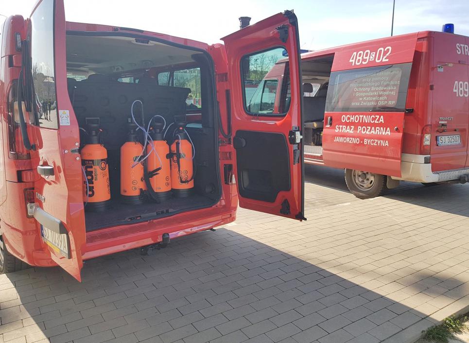 Strażacy z jaworznickich Ochotniczych Straży Pożarnych biorą udział w dezynfekcji miejskich przystanków autobusowych.