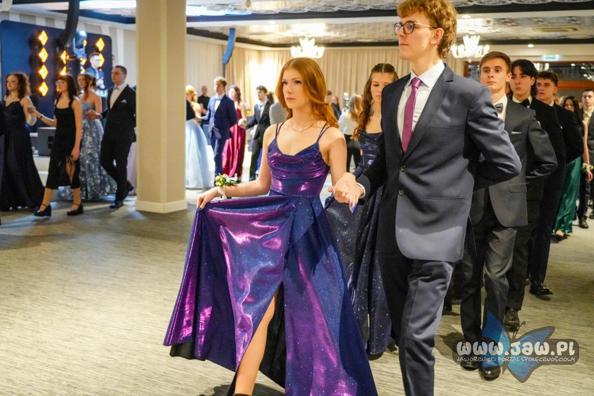 Bal studniówkowy otworzył tradycyjny polonez. Najpierw tegoroczni maturzyści zatańczyli krótki fragment razem ze swoimi nauczycielami. Następnie każda z czterech klas przedstawiła własny układ.